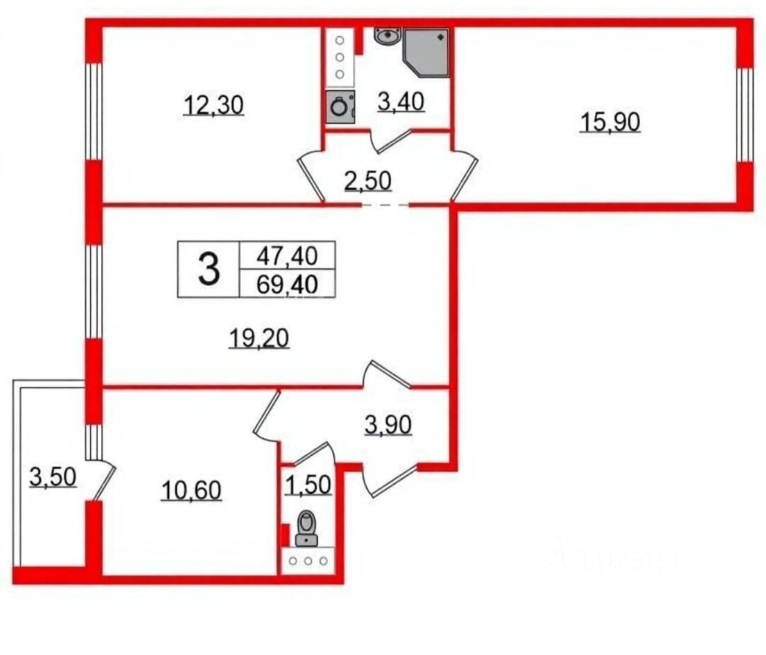 Купить 3-комн. квартиру, 69,4 м² в Санкт-Петербурге без посредников